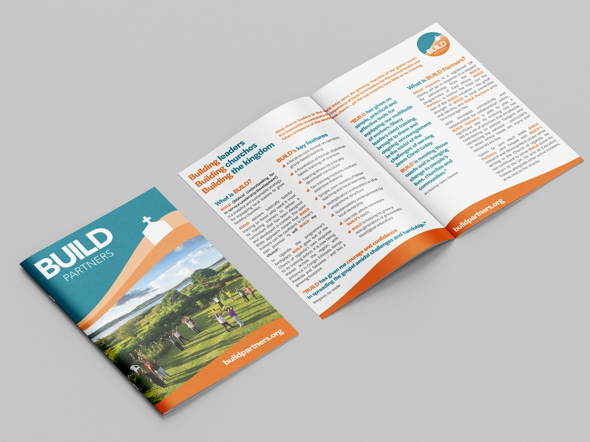 BUILD Partners help train local church leaders, who then in turn train others, in eastern Africa. They had a logo and website, but needed a house style that could be applied to screen and printed publicity. The colours and curves represent not just the geographical features of the areas where BUILD operates, but also book pages. The photography and strong typography make for a solid, recognisable style for all BUILD's communications.